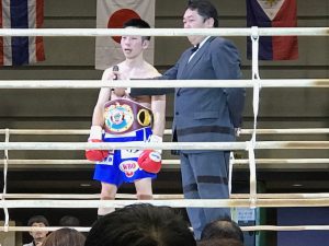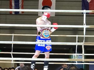 第1試合(WBOAPフライ級王座決定戦)に登場した工学研究科修士課程2年生の坂本真宏君(同級5位)は、同級1位のタイ国、クワンタイ・シスモーゼンに3R途中でKO勝ちし、見事チャンピオンになりました。日頃のトレーニングの成果もあるとおもいますが、頭脳的な試合運びで最初から圧倒していたのが、印象的でした。