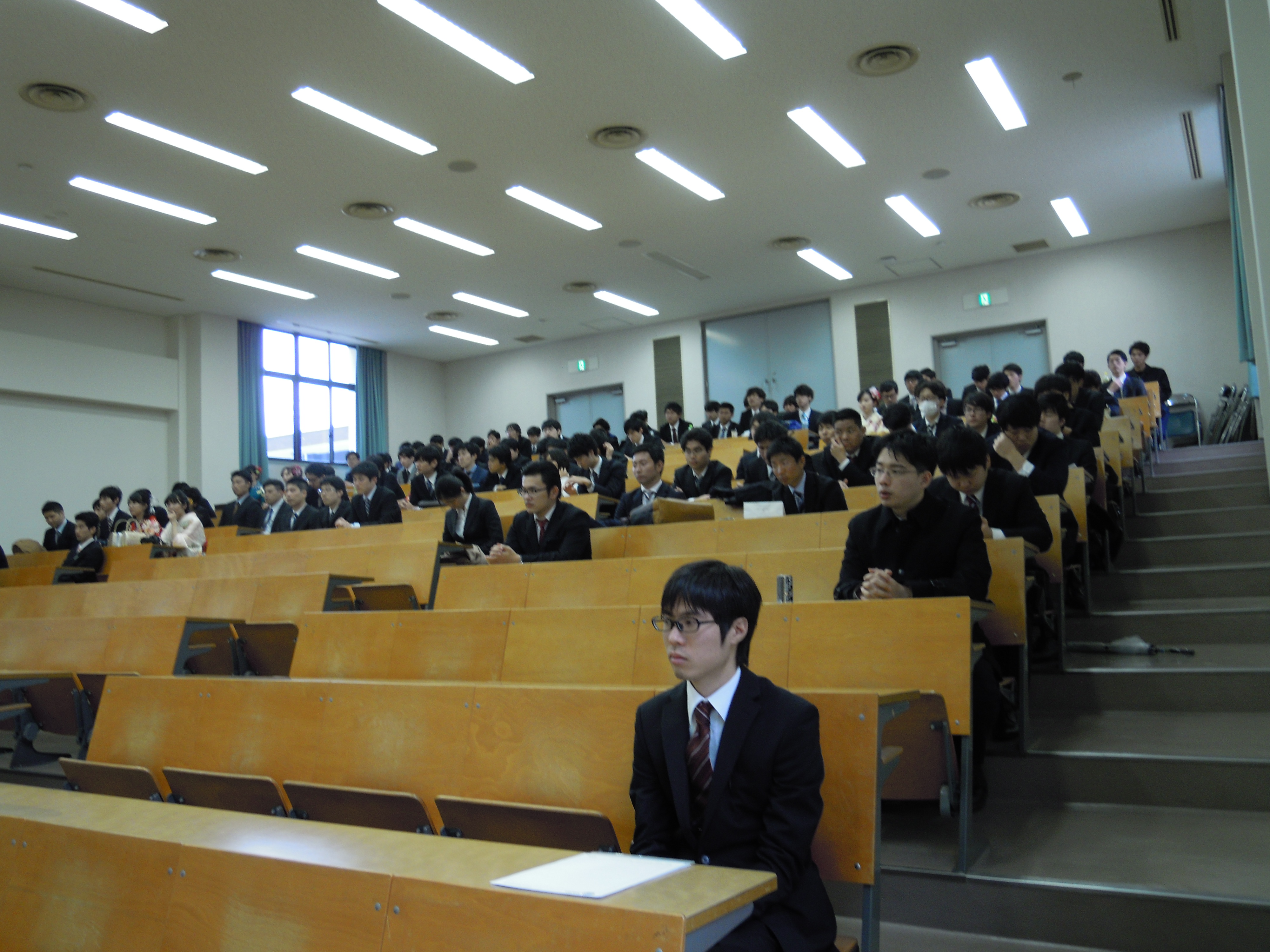 当日はあいにくの曇り空でしたが、校門から校舎に通ずる道路は、多くのあでやかな晴れ着姿の女子学生や初々しい背広姿の男子学生の、晴れやかな笑顔に溢れていました。