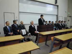 送別式では、長崎工学部長・工学部長職務代行より送別の辞のあと、工学部同窓会を代表して、黒山会長が祝辞を述べました。祝辞では、お祝いの言葉と共に、大阪市立大学卒業生としての自覚と誇りを持ち、自分の道を切り開いていかれることを期待していること、本日から同窓会会員として同窓会に積極的に参画していただきたい旨等を述べられました。