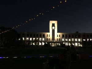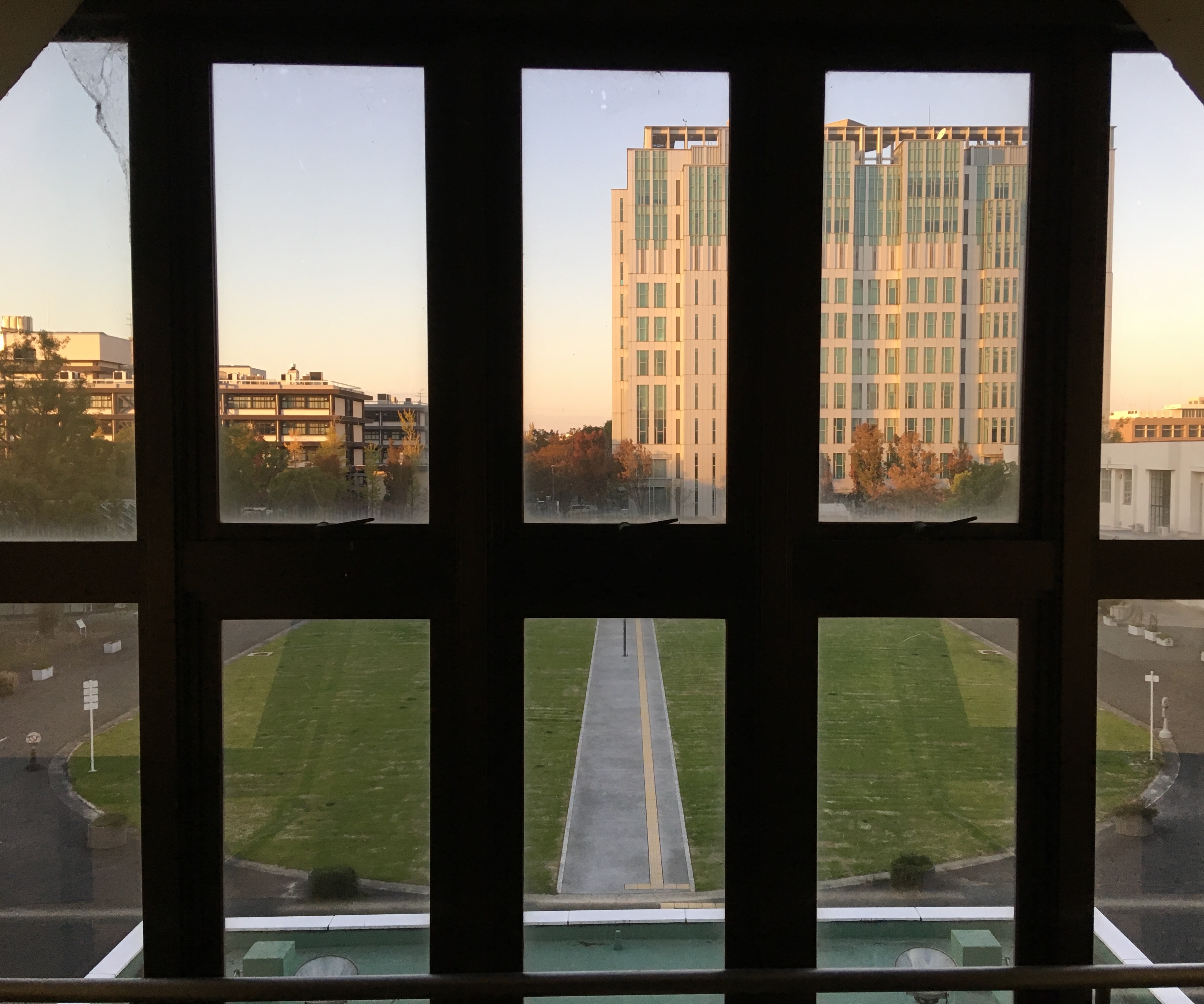 ワシントン椰子があった広場は、ビビットなグリーンが育っていて、イルミネーションやライトアップされた1号館と他の建物シルエットが織りなすおしゃれな空間になっていました。