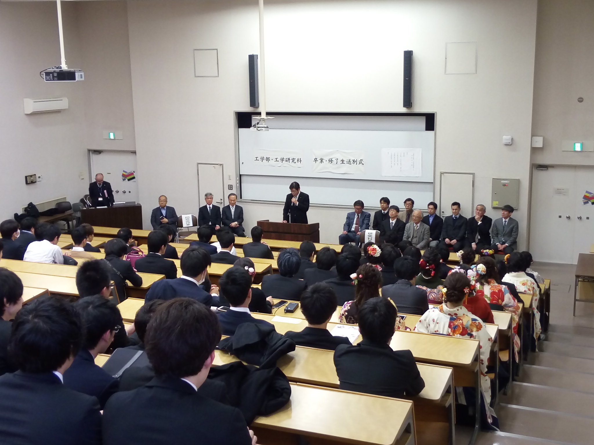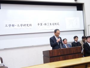 平成30年度工学部卒業生・修了生送別式が3月25日に工学部大講堂で行われました。工学部同窓会からは、宇野会長以下4名の理事が出席しました。