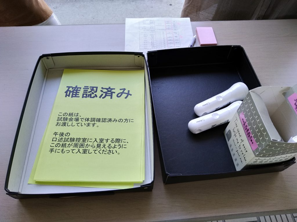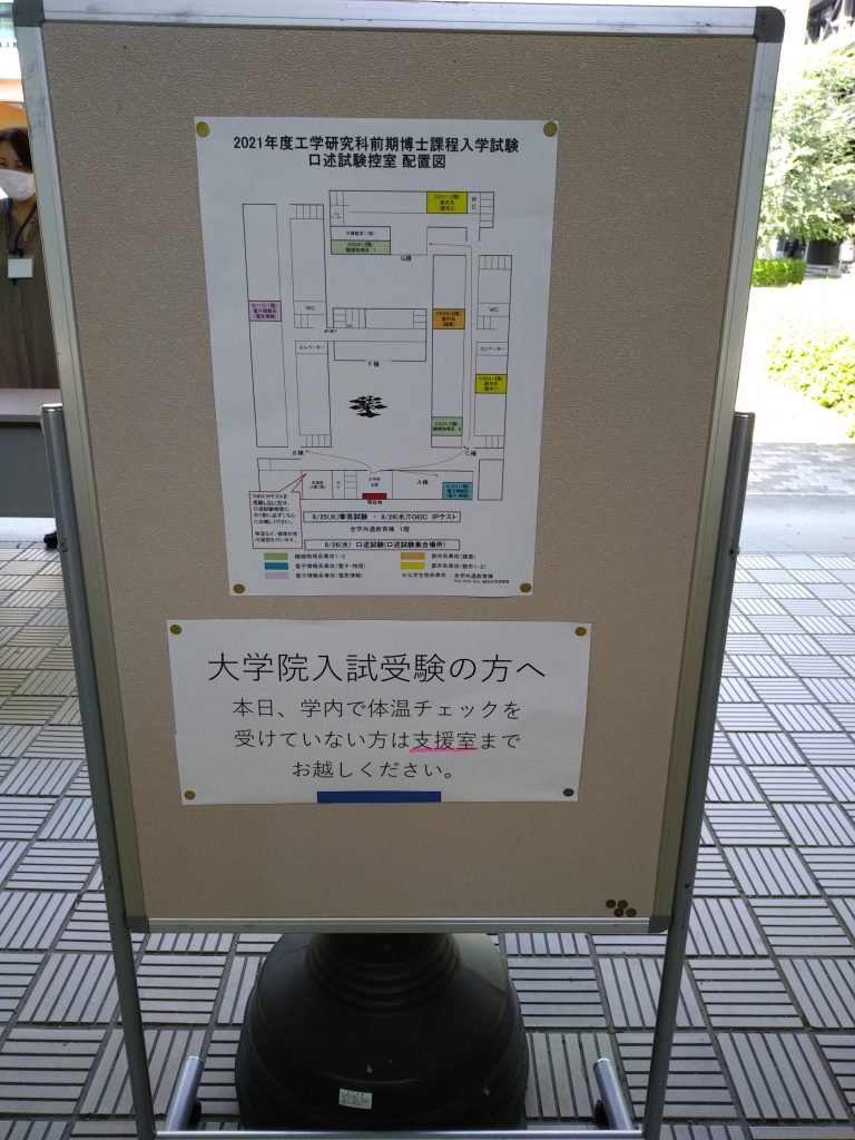 本日(8月26日)は、昨日の筆記試験に引き続き、工学研究科前期博士課程(修士)の口述試験日です。今年はコロナ禍ですので口述試験会場に入る前の体温チェックが実施されており、密を避けるため会場も分散されているようです。