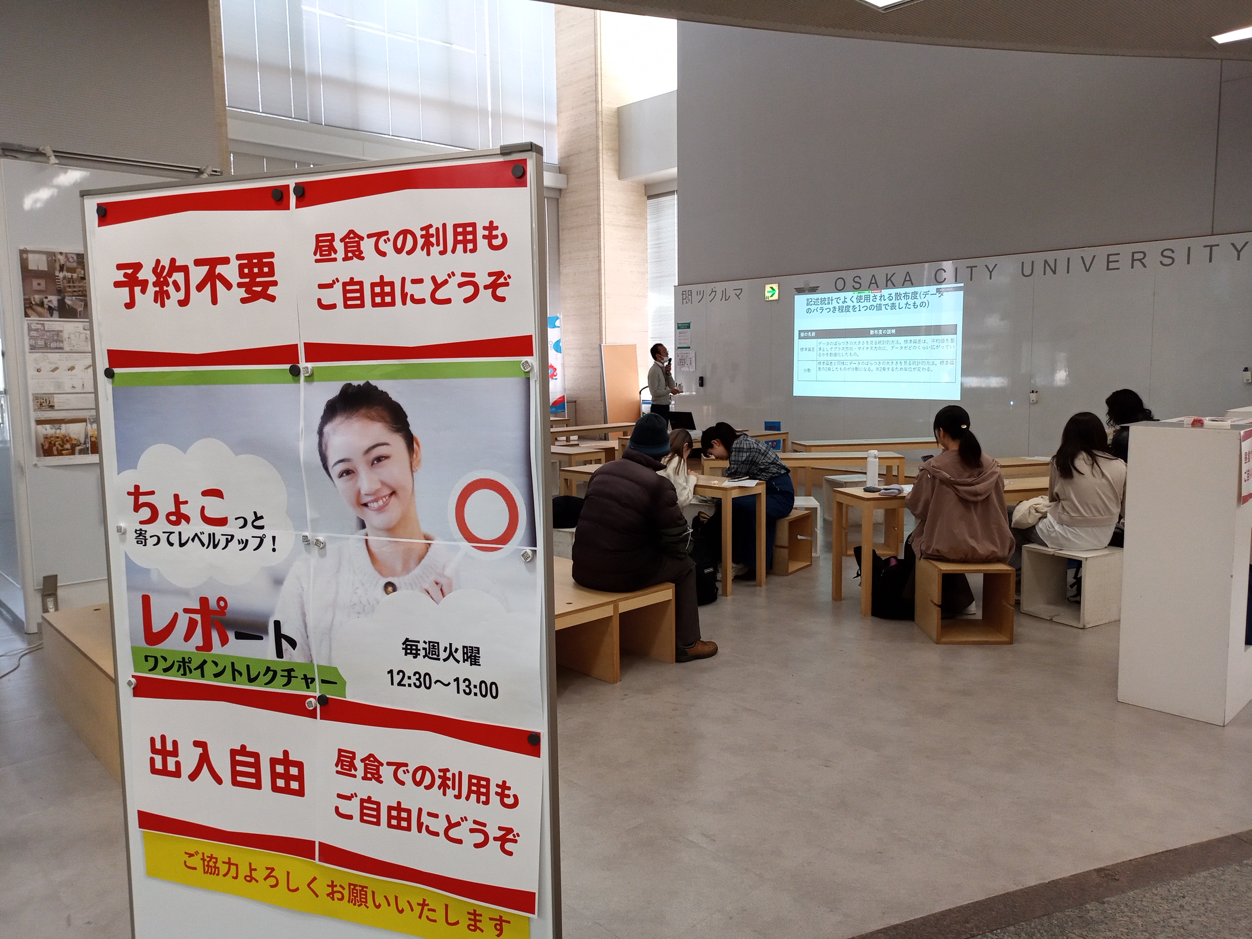 昼休みに図書館一階「ツクルマ」で開催されていたワンポイントセミナー。いい取り組みです。ただ、残念ながら聞いている学生の姿はまばら。
