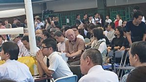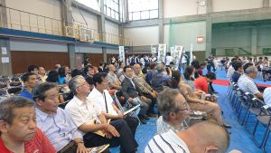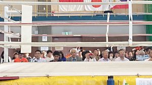 当日は荒川学長初め長崎健工学部長、宇野工学部同窓会会長、工学部南繁行教授、各部教授さんや同窓会OBの関係者など多数応援に駆けつけて来ておられました。坂本真宏さんは工学部の大学院生でチャンピオンに挑戦されるのは素晴らしい能力の持ち主でしょう。試合は6回途中で目じりの出血多量の為、ドクターストップで敗れましたが、今後の人生において素晴らしい実績を作られたと思います。当日の会場風景写真を掲載させて頂きます。